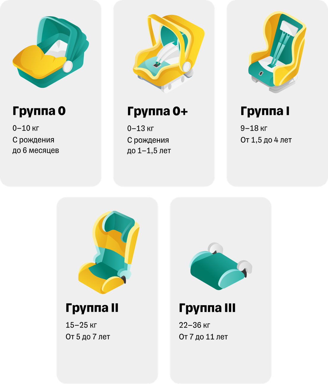 В России детские удерживающие системы чаще сертифицируются по стандарту ECE R44/04. В нем выделено пять весовых групп: 0, 0+, I, II и III.